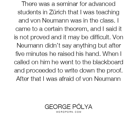 There was a seminar for advanced students in Zürich that I was teaching and von Neumann was in the class. I came to a certain theorem, and I said it is not proved and it may be difficult. Von Neumann didn’t say anything but after five minutes he raised his hand. When I called on him he went to the blackboard and proceeded to write down the proof. After that I was afraid of von Neumann