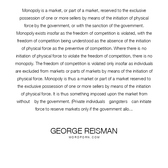 Monopoly is a market, or part of a market, reserved to the exclusive possession of one or more sellers by means of the initiation of physical force by the government, or with the sanction of the government. Monopoly exists insofar as the freedom of competition is violated, with the freedom of competition being understood as the absence of the initiation of physical force as the preventive of competition. Where there is no initiation of physical force to violate the freedom of competition, there is no monopoly. The freedom of competition is violated only insofar as individuals are excluded from markets or parts of markets by means of the initiation of physical force. Monopoly is thus a market or part of a market reserved to the exclusive possession of one or more sellers by means of the initiation of physical force. It is thus something imposed upon the market from without—by the government. (Private individuals—gangsters—can initiate force to reserve markets only if the government allows it and thereby sanctions it.)Thus, monopoly is not something which emerges from the normal operation of the economic system, and which the government must control