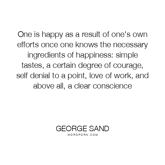 One is happy as a result of one's own efforts once one knows the necessary ingredients of happiness: simple tastes, a certain degree of courage, self denial to a point, love of work, and above all, a clear conscience