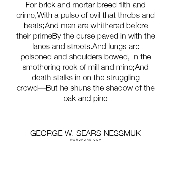 For brick and mortar breed filth and crime,With a pulse of evil that throbs and beats;And men are whithered before their primeBy the curse paved in with the lanes and streets.And lungs are poisoned and shoulders bowed, In the smothering reek of mill and mine;And death stalks in on the struggling crowd—But he shuns the shadow of the oak and pine