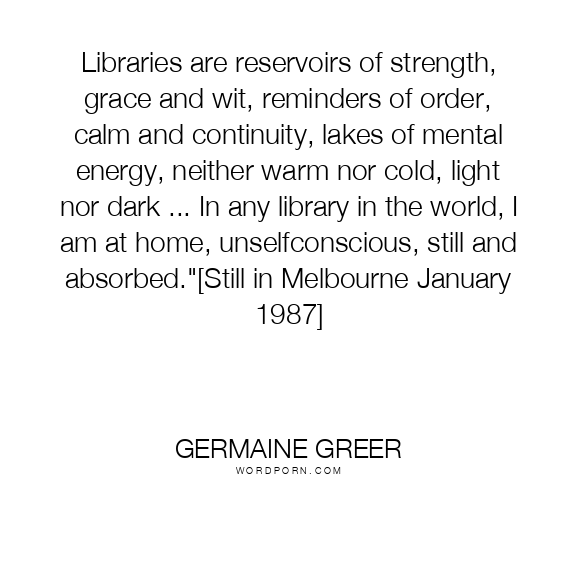 Libraries are reservoirs of strength, grace and wit, reminders of order, calm and continuity, lakes of mental energy, neither warm nor cold, light nor dark ... In any library in the world, I am at home, unselfconscious, still and absorbed."[Still in Melbourne January 1987]