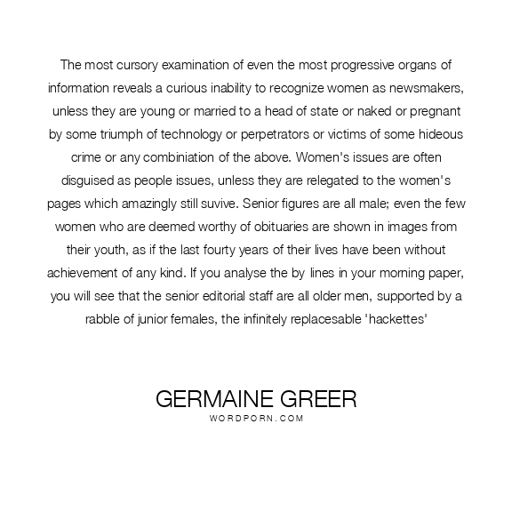 The most cursory examination of even the most progressive organs of information reveals a curious inability to recognize women as newsmakers, unless they are young or married to a head of state or naked or pregnant by some triumph of technology or perpetrators or victims of some hideous crime or any combiniation of the above. Women's issues are often disguised as people issues, unless they are relegated to the women's pages which amazingly still suvive. Senior figures are all male; even the few women who are deemed worthy of obituaries are shown in images from their youth, as if the last fourty years of their lives have been without achievement of any kind. If you analyse the by-lines in your morning paper, you will see that the senior editorial staff are all older men, supported by a rabble of junior females, the infinitely replacesable 'hackettes'