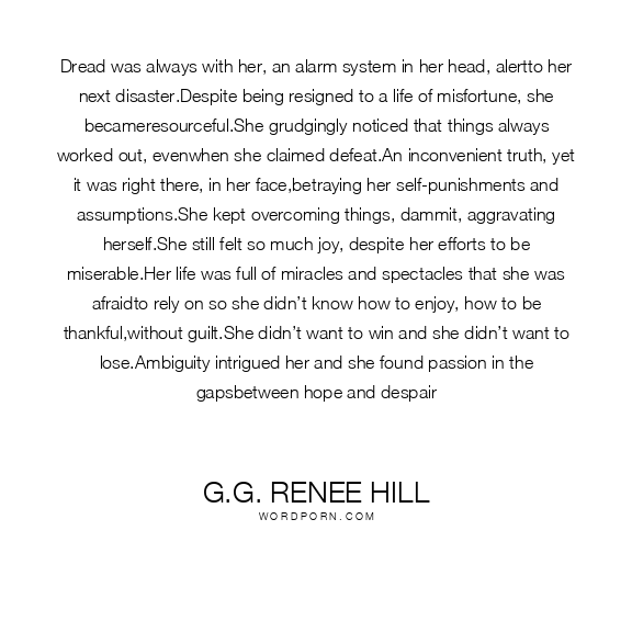 Dread was always with her, an alarm system in her head, alertto her next disaster.Despite being resigned to a life of misfortune, she becameresourceful.She grudgingly noticed that things always worked out, evenwhen she claimed defeat.An inconvenient truth, yet it was right there, in her face,betraying her self-punishments and assumptions.She kept overcoming things, dammit, aggravating herself.She still felt so much joy, despite her efforts to be miserable.Her life was full of miracles and spectacles that she was afraidto rely on so she didn’t know how to enjoy, how to be thankful,without guilt.She didn’t want to win and she didn’t want to lose.Ambiguity intrigued her and she found passion in the gapsbetween hope and despair