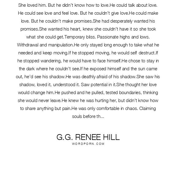 She loved him. But he didn’t know how to love.He could talk about love. He could see love and feel love. But he couldn’t give love.He could make love. But he couldn’t make promises.She had desperately wanted his promises.She wanted his heart, knew she couldn’t have it so she took what she could get.Temporary bliss. Passionate highs and lows. Withdrawal and manipulation.He only stayed long enough to take what he needed and keep moving.If he stopped moving, he would self-destruct.If he stopped wandering, he would have to face himself.He chose to stay in the dark where he couldn’t see.If he exposed himself and the sun came out, he’d see his shadow.He was deathly afraid of his shadow.She saw his shadow, loved it, understood it. Saw potential in it.She thought her love would change him.He pushed and he pulled, tested boundaries, thinking she would never leave.He knew he was hurting her, but didn’t know how to share anything but pain.He was only comfortable in chaos. Claiming souls before they could claim him.Her love, her body, she had given to him and he’d taken with such feigned sincerity, absorbing every drop of her.His dark heart concealed.She’d let him enter her spirit and stroke her soul where everything is love and sensation and surrender.Wide open, exposed to deception.It had never occurred to her that this desire was not love.It was blinding the way she wanted him.She couldn’t see what was really happening, only what she wanted to happen.She suspected that he would always seek to minimize the risk of being split open, his secrets revealed.He valued his soul’s privacy far more than he valued the intimacy of sincere connection so he kept his distance at any and all costs.Intimacy would lead to his undoing—in his mind, an irrational and indulgent mistake.When she discovered his indiscretions, she threw love in his face and beat him with it.Somewhere deep down, in her labyrinth, her intricacy, the darkest part of her soul, she relished the mayhem.She felt a sense of privilege for having such passion in her life.He stirred her core.The place she dared not enter.The place she could not stir for herself.But something wasn’t right.His eyes were cold and dark.His energy, unaffected.He laughed at her and her antics, told her she was a mess.Frantic, she looked for love hiding in his eyes, in his face, in his stance, and she found nothing but disdain.And her heart stopped