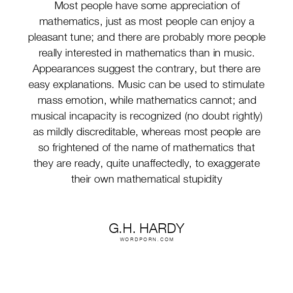 Most people have some appreciation of mathematics, just as most people can enjoy a pleasant tune; and there are probably more people really interested in mathematics than in music. Appearances suggest the contrary, but there are easy explanations. Music can be used to stimulate mass emotion, while mathematics cannot; and musical incapacity is recognized (no doubt rightly) as mildly discreditable, whereas most people are so frightened of the name of mathematics that they are ready, quite unaffectedly, to exaggerate their own mathematical stupidity