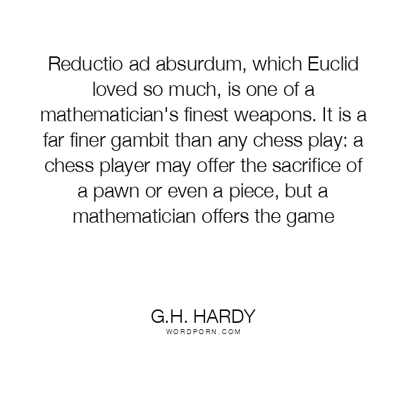 Reductio ad absurdum, which Euclid loved so much, is one of a mathematician's finest weapons. It is a far finer gambit than any chess play: a chess player may offer the sacrifice of a pawn or even a piece, but a mathematician offers the game