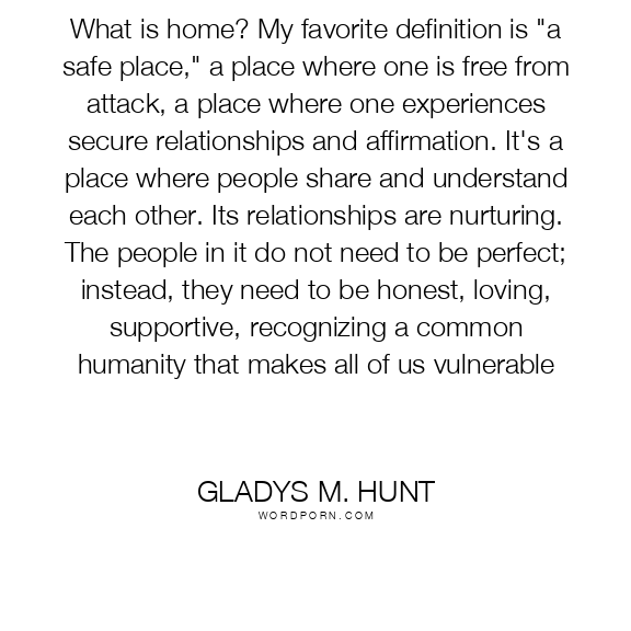 What is home? My favorite definition is "a safe place," a place where one is free from attack, a place where one experiences secure relationships and affirmation. It's a place where people share and understand each other. Its relationships are nurturing. The people in it do not need to be perfect; instead, they need to be honest, loving, supportive, recognizing a common humanity that makes all of us vulnerable