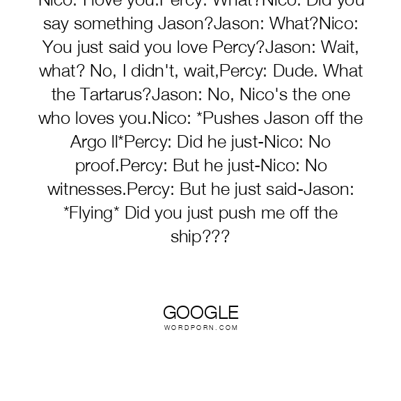 Nico: I love you.Percy: What?Nico: Did you say something Jason?Jason: What?Nico: You just said you love Percy?Jason: Wait, what? No, I didn't, wait,Percy: Dude. What the Tartarus?Jason: No, Nico's the one who loves you.Nico: *Pushes Jason off the Argo ll*Percy: Did he just-Nico: No proof.Percy: But he just-Nico: No witnesses.Percy: But he just said-Jason: *Flying* Did you just push me off the ship???