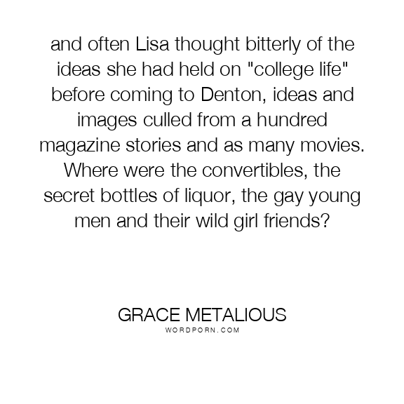 and often Lisa thought bitterly of the ideas she had held on "college life" before coming to Denton, ideas and images culled from a hundred magazine stories and as many movies. Where were the convertibles, the secret bottles of liquor, the gay young men and their wild girl friends?