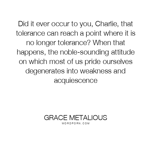 Did it ever occur to you, Charlie, that tolerance can reach a point where it is no longer tolerance? When that happens, the noble-sounding attitude on which most of us pride ourselves degenerates into weakness and acquiescence