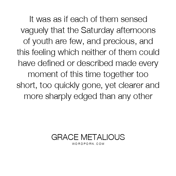 It was as if each of them sensed vaguely that the Saturday afternoons of youth are few, and precious, and this feeling which neither of them could have defined or described made every moment of this time together too short, too quickly gone, yet clearer and more sharply edged than any other