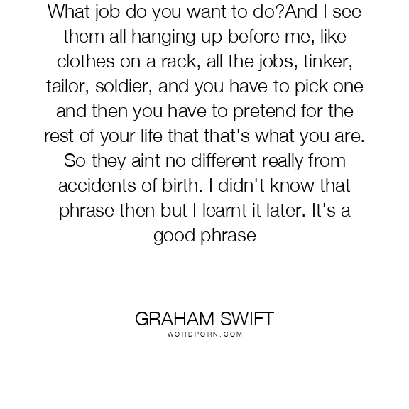 What job do you want to do?And I see them all hanging up before me, like clothes on a rack, all the jobs, tinker, tailor, soldier, and you have to pick one and then you have to pretend for the rest of your life that that's what you are. So they aint no different really from accidents of birth. I didn't know that phrase then but I learnt it later. It's a good phrase