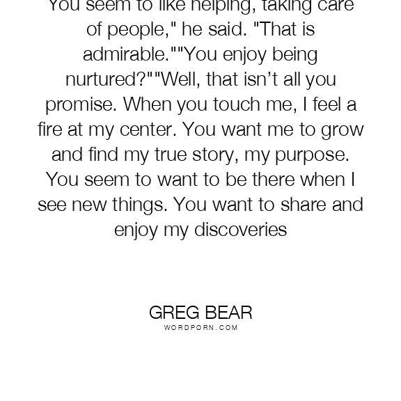 You seem to like helping, taking care of people," he said. "That is admirable.""You enjoy being nurtured?""Well, that isn’t all you promise. When you touch me, I feel a fire at my center. You want me to grow and find my true story, my purpose. You seem to want to be there when I see new things. You want to share and enjoy my discoveries