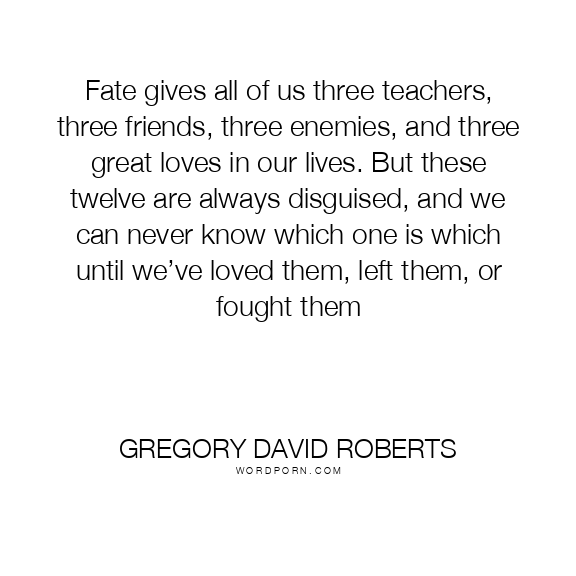 Fate gives all of us three teachers, three friends, three enemies, and three great loves in our lives. But these twelve are always disguised, and we can never know which one is which until we’ve loved them, left them, or fought them
