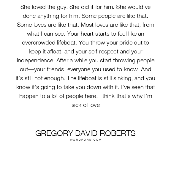 She loved the guy. She did it for him. She would’ve done anything for him. Some people are like that. Some loves are like that. Most loves are like that, from what I can see. Your heart starts to feel like an overcrowded lifeboat. You throw your pride out to keep it afloat, and your self-respect and your independence. After a while you start throwing people out—your friends, everyone you used to know. And it’s still not enough. The lifeboat is still sinking, and you know it’s going to take you down with it. I’ve seen that happen to a lot of people here. I think that’s why I’m sick of love