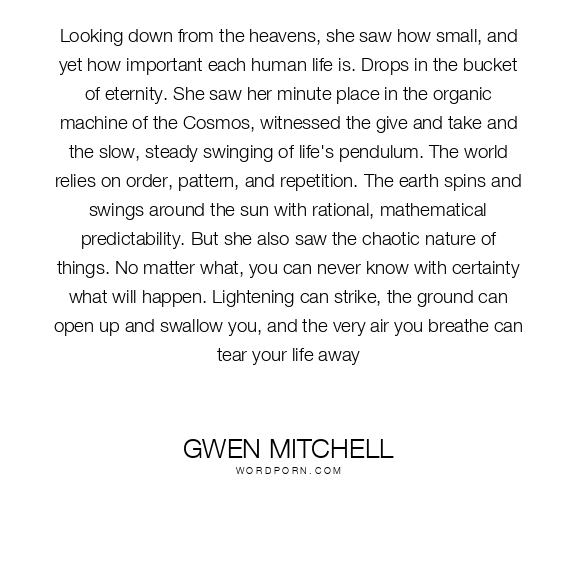 Looking down from the heavens, she saw how small, and yet how important each human life is. Drops in the bucket of eternity. She saw her minute place in the organic machine of the Cosmos, witnessed the give and take and the slow, steady swinging of life's pendulum. The world relies on order, pattern, and repetition. The earth spins and swings around the sun with rational, mathematical predictability. But she also saw the chaotic nature of things. No matter what, you can never know with certainty what will happen. Lightening can strike, the ground can open up and swallow you, and the very air you breathe can tear your life away