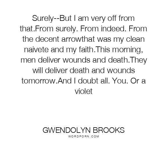 Surely--But I am very off from that.From surely. From indeed. From the decent arrowthat was my clean naivete and my faith.This morning, men deliver wounds and death.They will deliver death and wounds tomorrow.And I doubt all. You. Or a violet
