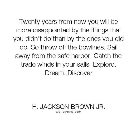 Twenty years from now you will be more disappointed by the things that you didn't do than by the ones you did do. So throw off the bowlines. Sail away from the safe harbor. Catch the trade winds in your sails. Explore. Dream. Discover