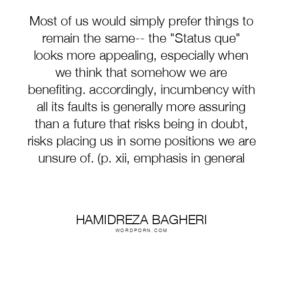 Most of us would simply prefer things to remain the same-- the "Status que" looks more appealing, especially when we think that somehow we are benefiting. accordingly, incumbency with all its faults is generally more assuring than a future that risks being in doubt, risks placing us in some positions we are unsure of. (p. xii, emphasis in general