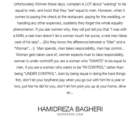 Unfortunately Women these days, complain A LOT about "wanting" to be equal to men, and insist that they "are" equal to men. However, when it comes to paying the check at the restaurant, paying for the wedding, or handling any other expenses, suddenly they forget the whole equality phenomenon. If you ask women why, they will just tell you that "I was with a MAN, a real man doesn't let a woman touch her purse, a real man takes care of his lady"... ((So they know the difference between a "Man" and a "Woman"... ))- Man spends, man takes responsibility, man has control...- Woman gets taken care of, women expects man to take responsibility, woman is under control!If you are a woman who "WANTS" to be equal to men, if you are a woman who wants to be "IN CONTROL" rather than being "UNDER CONTROL", start by being equal in doing the hard things first, don't let your boyfriend pay when you go out with him for a year or two, just like he did for you, don't let him pick you up at your home, drive everyday and pick him up to go out for a year or two, if you think it's so hard to do so, keep quite about it... you're not ready to be equal... You're just adequate enough to be taken care of... to be spent for