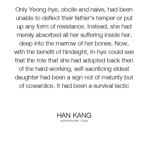 Only Yeong-hye, docile and naive, had been unable to deflect their father's temper or put up any form of resistance. Instead, she had merely absorbed all her suffering inside her, deep into the marrow of her bones. Now, with the benefit of hindsight, In-hye could see that the role that she had adopted back then of the hard-working, self-sacrificing eldest daughter had been a sign not of maturity but of cowardice. It had been a survival tactic