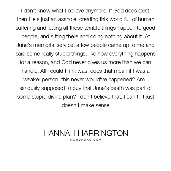 I don't know what I believe anymore. If God does exist, then He's just an asshole, creating this world full of human suffering and letting all these terrible things happen to good people, and sitting there and doing nothing about it. At June's memorial service, a few people came up to me and said some really stupid things, like how everything happens for a reason, and God never gives us more than we can handle. All I could think was, does that mean if I was a weaker person, this never would've happened? Am I seriously supposed to buy that June's death was part of some stupid divine plan? I don't believe that. I can't. It just doesn't make sense