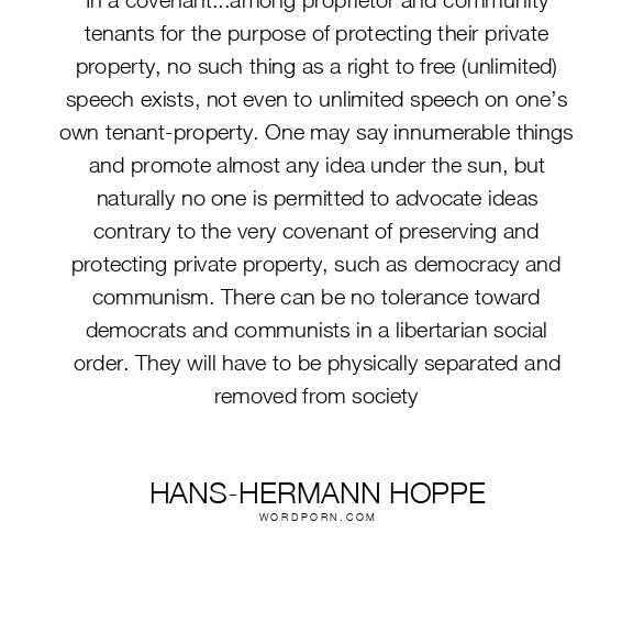 In a covenant...among proprietor and community tenants for the purpose of protecting their private property, no such thing as a right to free (unlimited) speech exists, not even to unlimited speech on one’s own tenant-property. One may say innumerable things and promote almost any idea under the sun, but naturally no one is permitted to advocate ideas contrary to the very covenant of preserving and protecting private property, such as democracy and communism. There can be no tolerance toward democrats and communists in a libertarian social order. They will have to be physically separated and removed from society