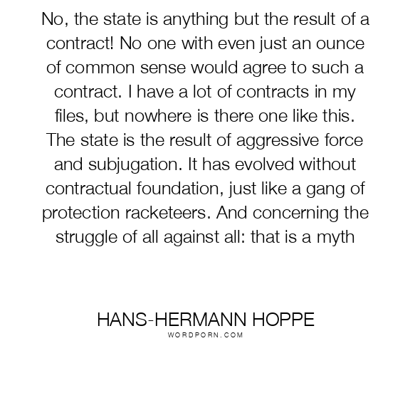 No, the state is anything but the result of a contract! No one with even just an ounce of common sense would agree to such a contract. I have a lot of contracts in my files, but nowhere is there one like this. The state is the result of aggressive force and subjugation. It has evolved without contractual foundation, just like a gang of protection racketeers. And concerning the struggle of all against all: that is a myth