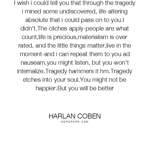 I wish i could tell you that through the tragedy i mined some undiscovered, life-altering absolute that i could pass on to you.I didn't.The cliches apply-people are what count,life is precious,materialism is over rated, and the little things matter,live in the moment-and i can repeat them to you ad nauseam.you might listen, but you won't internalize.Tragedy hammers it hm.Tragedy etches into your soul.You might not be happier.But you will be better