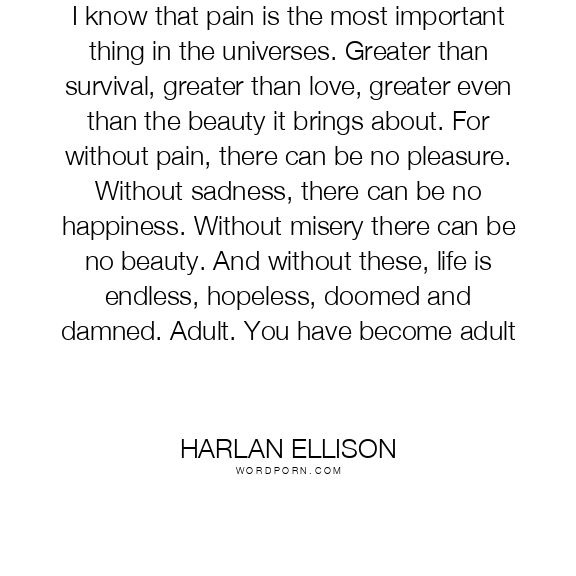 I know that pain is the most important thing in the universes. Greater than survival, greater than love, greater even than the beauty it brings about. For without pain, there can be no pleasure. Without sadness, there can be no happiness. Without misery there can be no beauty. And without these, life is endless, hopeless, doomed and damned. Adult. You have become adult