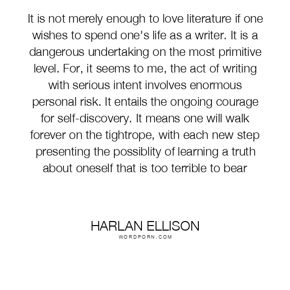 It is not merely enough to love literature if one wishes to spend one's life as a writer. It is a dangerous undertaking on the most primitive level. For, it seems to me, the act of writing with serious intent involves enormous personal risk. It entails the ongoing courage for self-discovery. It means one will walk forever on the tightrope, with each new step presenting the possiblity of learning a truth about oneself that is too terrible to bear