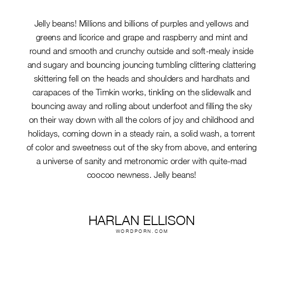 Jelly beans! Millions and billions of purples and yellows and greens and licorice and grape and raspberry and mint and round and smooth and crunchy outside and soft-mealy inside and sugary and bouncing jouncing tumbling clittering clattering skittering fell on the heads and shoulders and hardhats and carapaces of the Timkin works, tinkling on the slidewalk and bouncing away and rolling about underfoot and filling the sky on their way down with all the colors of joy and childhood and holidays, coming down in a steady rain, a solid wash, a torrent of color and sweetness out of the sky from above, and entering a universe of sanity and metronomic order with quite-mad coocoo newness. Jelly beans!