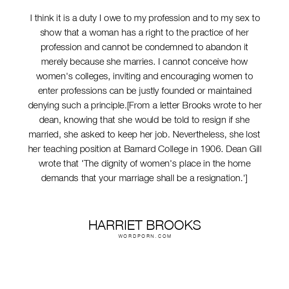 I think it is a duty I owe to my profession and to my sex to show that a woman has a right to the practice of her profession and cannot be condemned to abandon it merely because she marries. I cannot conceive how women's colleges, inviting and encouraging women to enter professions can be justly founded or maintained denying such a principle.[From a letter Brooks wrote to her dean, knowing that she would be told to resign if she married, she asked to keep her job. Nevertheless, she lost her teaching position at Barnard College in 1906. Dean Gill wrote that 'The dignity of women's place in the home demands that your marriage shall be a resignation.']