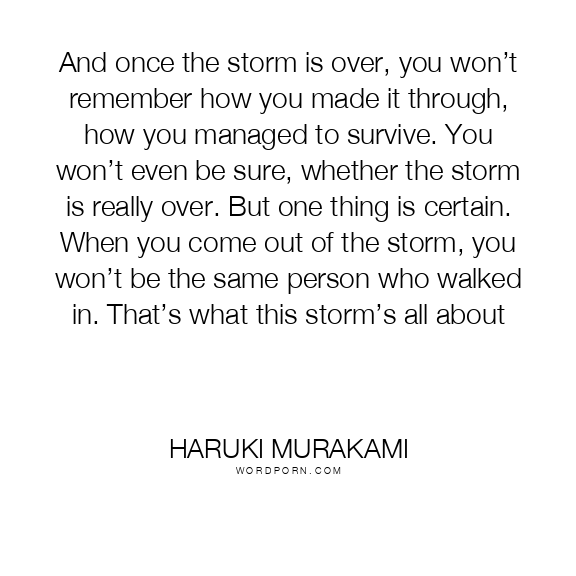 And once the storm is over, you won’t remember how you made it through, how you managed to survive. You won’t even be sure, whether the storm is really over. But one thing is certain. When you come out of the storm, you won’t be the same person who walked in. That’s what this storm’s all about