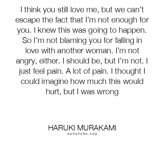I think you still love me, but we can’t escape the fact that I’m not enough for you. I knew this was going to happen. So I’m not blaming you for falling in love with another woman. I’m not angry, either. I should be, but I’m not. I just feel pain. A lot of pain. I thought I could imagine how much this would hurt, but I was wrong