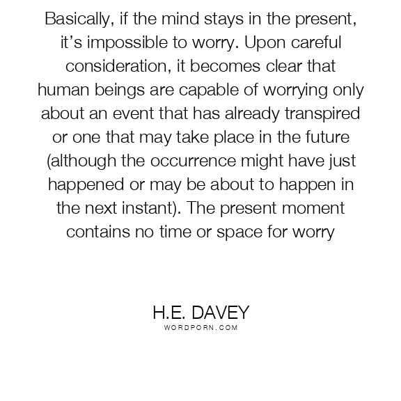 Basically, if the mind stays in the present, it’s impossible to worry. Upon careful consideration, it becomes clear that human beings are capable of worrying only about an event that has already transpired or one that may take place in the future (although the occurrence might have just happened or may be about to happen in the next instant). The present moment contains no time or space for worry
