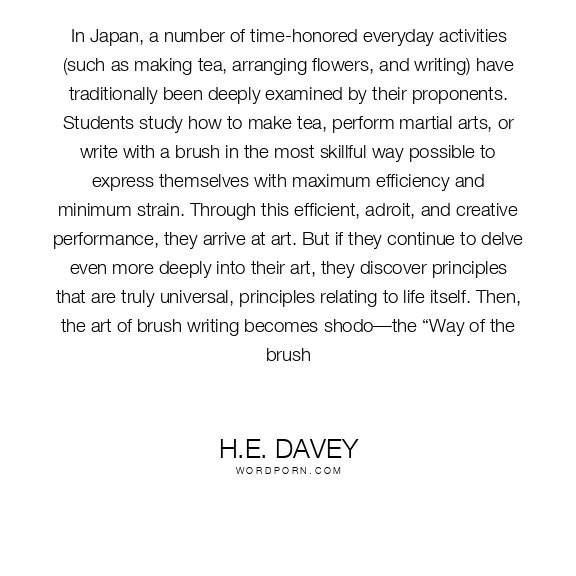 In Japan, a number of time-honored everyday activities (such as making tea, arranging flowers, and writing) have traditionally been deeply examined by their proponents. Students study how to make tea, perform martial arts, or write with a brush in the most skillful way possible to express themselves with maximum efficiency and minimum strain. Through this efficient, adroit, and creative performance, they arrive at art. But if they continue to delve even more deeply into their art, they discover principles that are truly universal, principles relating to life itself. Then, the art of brush writing becomes shodo—the “Way of the brush