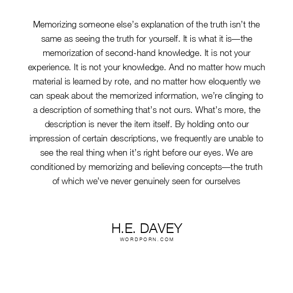 Memorizing someone else’s explanation of the truth isn’t the same as seeing the truth for yourself. It is what it is—the memorization of second-hand knowledge. It is not your experience. It is not your knowledge. And no matter how much material is learned by rote, and no matter how eloquently we can speak about the memorized information, we’re clinging to a description of something that’s not ours. What’s more, the description is never the item itself. By holding onto our impression of certain descriptions, we frequently are unable to see the real thing when it’s right before our eyes. We are conditioned by memorizing and believing concepts—the truth of which we’ve never genuinely seen for ourselves