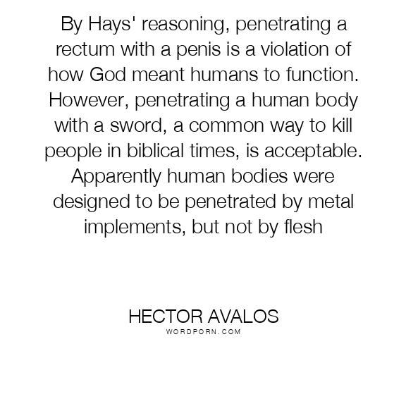 By Hays' reasoning, penetrating a rectum with a penis is a violation of how God meant humans to function. However, penetrating a human body with a sword, a common way to kill people in biblical times, is acceptable. Apparently human bodies were designed to be penetrated by metal implements, but not by flesh
