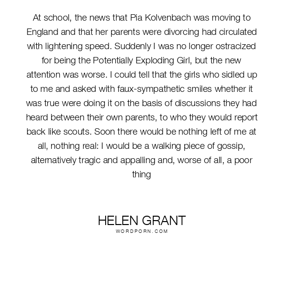 At school, the news that Pia Kolvenbach was moving to England and that her parents were divorcing had circulated with lightening speed. Suddenly I was no longer ostracized for being the Potentially Exploding Girl, but the new attention was worse. I could tell that the girls who sidled up to me and asked with faux-sympathetic smiles whether it was true were doing it on the basis of discussions they had heard between their own parents, to who they would report back like scouts. Soon there would be nothing left of me at all, nothing real: I would be a walking piece of gossip, alternatively tragic and appalling and, worse of all, a poor thing