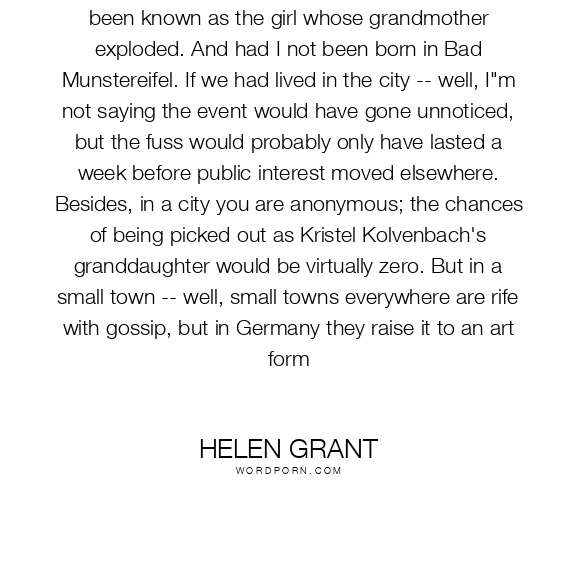 My life might have been so different, had I not been known as the girl whose grandmother exploded. And had I not been born in Bad Munstereifel. If we had lived in the city -- well, I"m not saying the event would have gone unnoticed, but the fuss would probably only have lasted a week before public interest moved elsewhere. Besides, in a city you are anonymous; the chances of being picked out as Kristel Kolvenbach's granddaughter would be virtually zero. But in a small town -- well, small towns everywhere are rife with gossip, but in Germany they raise it to an art form