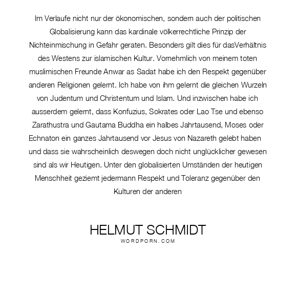 Im Verlaufe nicht nur der ökonomischen, sondern auch der politischen Globalisierung kann das kardinale völkerrechtliche Prinzip der Nichteinmischung in Gefahr geraten. Besonders gilt dies für dasVerhältnis des Westens zur islamischen Kultur. Vornehmlich von meinem toten muslimischen Freunde Anwar as-Sadat habe ich den Respekt gegenüber anderen Religionen gelernt. Ich habe von ihm gelernt die gleichen Wurzeln von Judentum und Christentum und Islam. Und inzwischen habe ich ausserdem gelernt, dass Konfuzius, Sokrates oder Lao Tse und ebenso Zarathustra und Gautama Buddha ein halbes Jahrtausend, Moses oder Echnaton ein ganzes Jahrtausend vor Jesus von Nazareth gelebt haben - und dass sie wahrscheinlich deswegen doch nicht unglücklicher gewesen sind als wir Heutigen. Unter den globalisierten Umständen der heutigen Menschheit geziemt jedermann Respekt und Toleranz gegenüber den Kulturen der anderen