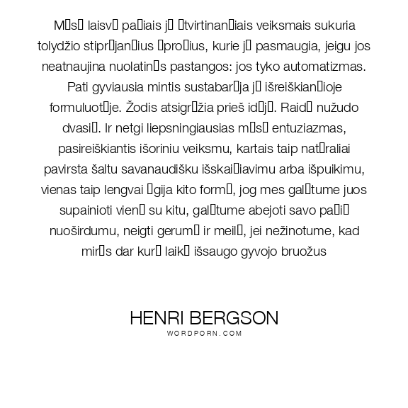 Mūsų laisvė pačiais ją įtvirtinančiais veiksmais sukuria tolydžio stiprėjančius įpročius, kurie ją pasmaugia, jeigu jos neatnaujina nuolatinės pastangos: jos tyko automatizmas. Pati gyviausia mintis sustabarėja ją išreiškiančioje formuluotėje. Žodis atsigręžia prieš idėją. Raidė nužudo dvasią. Ir netgi liepsningiausias mūsų entuziazmas, pasireiškiantis išoriniu veiksmu, kartais taip natūraliai pavirsta šaltu savanaudišku išskaičiavimu arba išpuikimu, vienas taip lengvai įgija kito formą, jog mes galėtume juos supainioti vieną su kitu, galėtume abejoti savo pačių nuoširdumu, neigti gerumą ir meilę, jei nežinotume, kad miręs dar kurį laiką išsaugo gyvojo bruožus