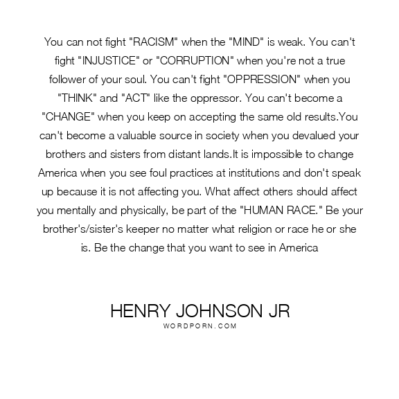 You can not fight "RACISM" when the "MIND" is weak. You can't fight "INJUSTICE" or "CORRUPTION" when you're not a true follower of your soul. You can't fight "OPPRESSION" when you "THINK" and "ACT" like the oppressor. You can't become a "CHANGE" when you keep on accepting the same old results.You can't become a valuable source in society when you devalued your brothers and sisters from distant lands.It is impossible to change America when you see foul practices at institutions and don't speak up because it is not affecting you. What affect others should affect you mentally and physically, be part of the "HUMAN RACE." Be your brother's/sister's keeper no matter what religion or race he or she is. Be the change that you want to see in America