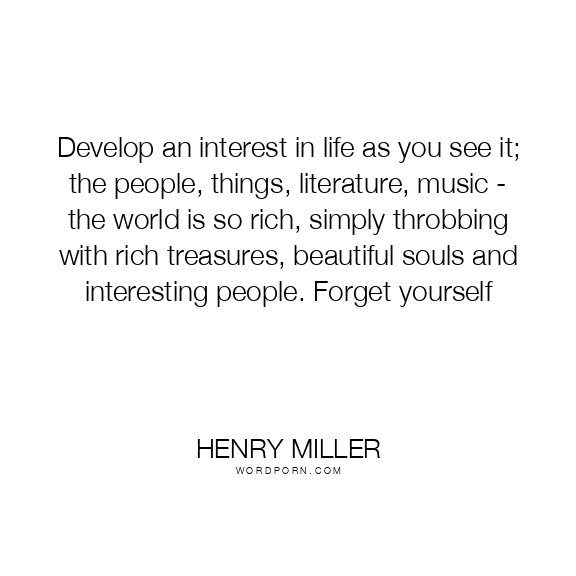 Develop an interest in life as you see it; the people, things, literature, music - the world is so rich, simply throbbing with rich treasures, beautiful souls and interesting people. Forget yourself