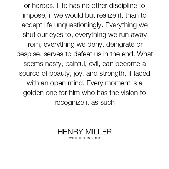 Life moves on, whether we act as cowards or heroes. Life has no other discipline to impose, if we would but realize it, than to accept life unquestioningly. Everything we shut our eyes to, everything we run away from, everything we deny, denigrate or despise, serves to defeat us in the end. What seems nasty, painful, evil, can become a source of beauty, joy, and strength, if faced with an open mind. Every moment is a golden one for him who has the vision to recognize it as such