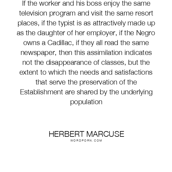 If the worker and his boss enjoy the same television program and visit the same resort places, if the typist is as attractively made up as the daughter of her employer, if the Negro owns a Cadillac, if they all read the same newspaper, then this assimilation indicates not the disappearance of classes, but the extent to which the needs and satisfactions that serve the preservation of the Establishment are shared by the underlying population