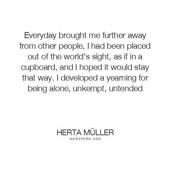 Everyday brought me further away from other people, I had been placed out of the world's sight, as if in a cupboard, and I hoped it would stay that way. I developed a yearning for being alone, unkempt, untended