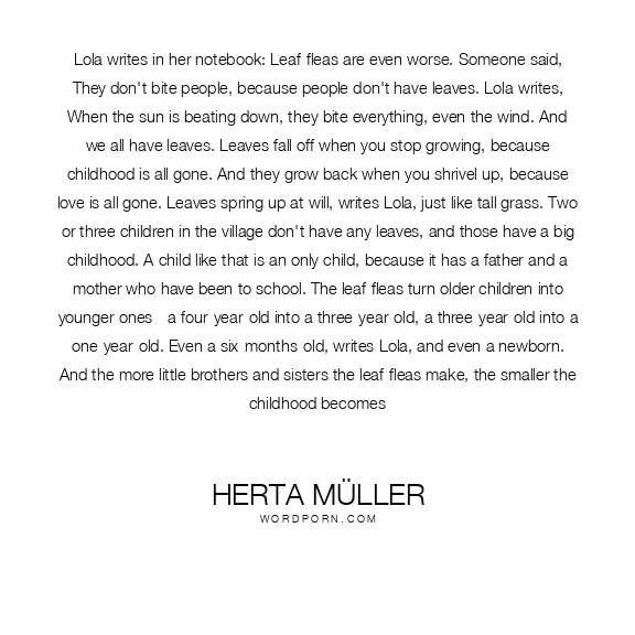 Lola writes in her notebook: Leaf-fleas are even worse. Someone said, They don't bite people, because people don't have leaves. Lola writes, When the sun is beating down, they bite everything, even the wind. And we all have leaves. Leaves fall off when you stop growing, because childhood is all gone. And they grow back when you shrivel up, because love is all gone. Leaves spring up at will, writes Lola, just like tall grass. Two or three children in the village don't have any leaves, and those have a big childhood. A child like that is an only child, because it has a father and a mother who have been to school. The leaf-fleas turn older children into younger ones - a four-year-old into a three-year-old, a three-year-old into a one-year-old. Even a six-months-old, writes Lola, and even a newborn. And the more little brothers and sisters the leaf-fleas make, the smaller the childhood becomes
