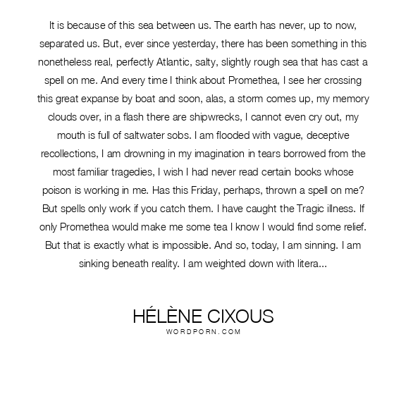 It is because of this sea between us. The earth has never, up to now, separated us. But, ever since yesterday, there has been something in this nonetheless real, perfectly Atlantic, salty, slightly rough sea that has cast a spell on me. And every time I think about Promethea, I see her crossing this great expanse by boat and soon, alas, a storm comes up, my memory clouds over, in a flash there are shipwrecks, I cannot even cry out, my mouth is full of saltwater sobs. I am flooded with vague, deceptive recollections, I am drowning in my imagination in tears borrowed from the most familiar tragedies, I wish I had never read certain books whose poison is working in me. Has this Friday, perhaps, thrown a spell on me? But spells only work if you catch them. I have caught the Tragic illness. If only Promethea would make me some tea I know I would find some relief. But that is exactly what is impossible. And so, today, I am sinning. I am sinking beneath reality. I am weighted down with literature. That is my fate. Yet I had the presence of mind to start this parenthesis, the only healthy moment in these damp, feverish hours. All this to try to come back to the surface of our book... Phone me quickly, Promethea, get me out of this parenthesis fast!)
